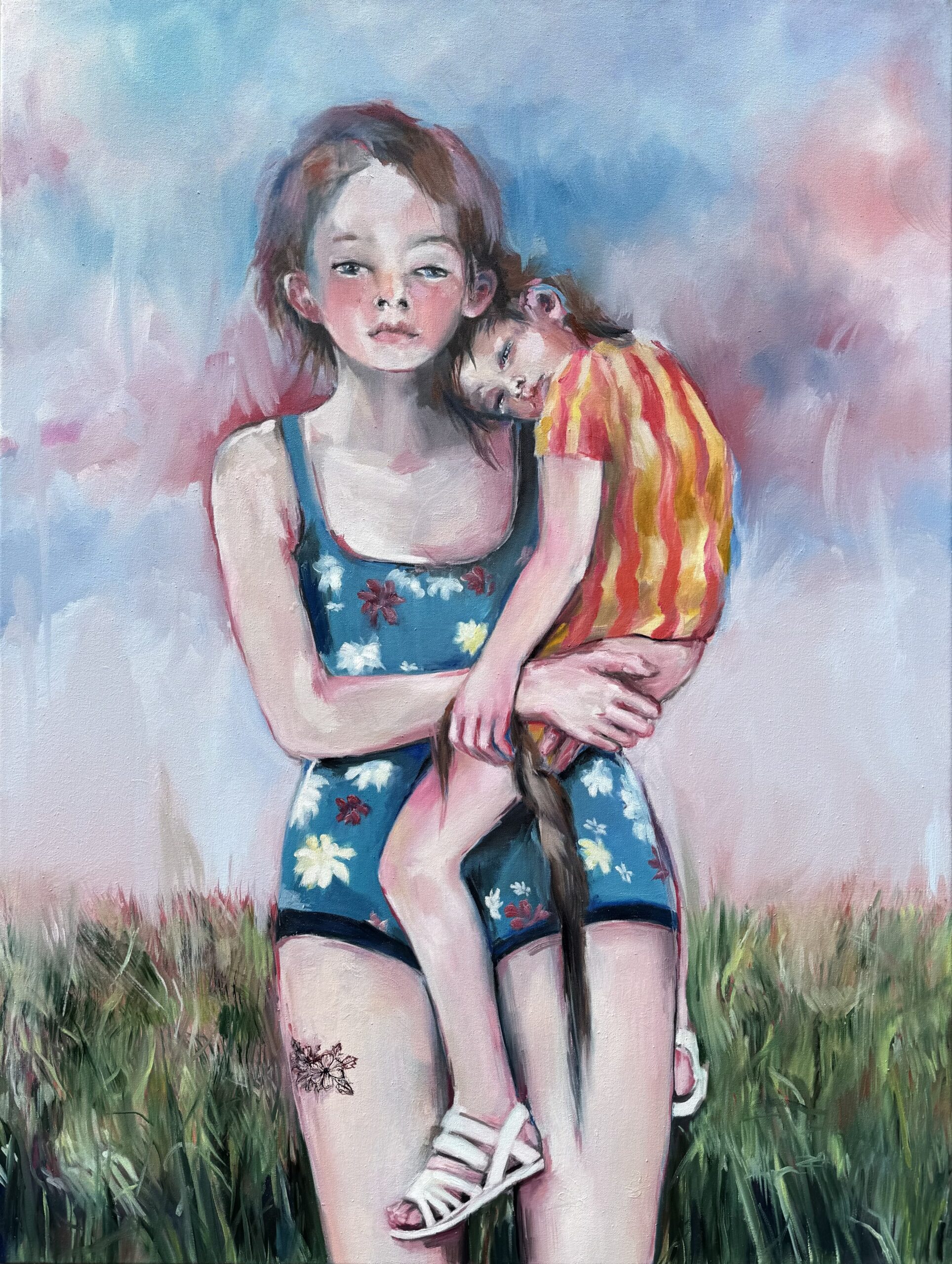 Sestry (z cyklu: Broskvová domácnost) / olej na plátně, 120×90 cm, 2025